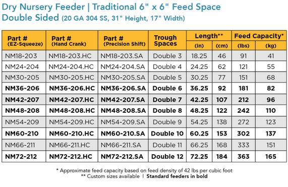 - NM (Dry Nursery feeder) - 1.5”/pig or 4 piglets /6” space.