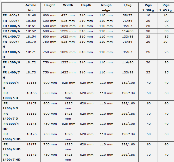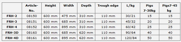 Many pig breeders consider keeping water and feed separately the best solution. This type of feeder can be used for almost any kind of feed. Two versions are available: The FR-H and F-H feeders featuring a plastic trough, and the FR and F feeders featuring a stainless steel trough.