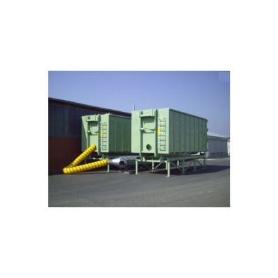 For drying wood chips and firewood. Dimensions: 6,000 x 2,350 x 2,400 mmHook system mounting. Capacity ca. 34 cbm. Additional ventilation floor made of perforated sheet. Inlet nozzles on front side. Cross channel in container. Vertical ladder. Tarpaulin storage. Container seen here on steel pedestal.