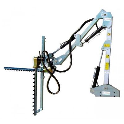 Shaped Dual Arm Saw suitable for Cutting hedges. Garden maintenance. Traffic islands maintenace. Very robust, solid reinforced mast. Horizontal cutting length: 1.100 mm. Vertical cutting length: 1.100 mm. Cutting capacity: Ø 20 mm. Hydraulic raising system with vertical cutting. Mechanical system for comb orientation. Mechanical system for horizontal cutting rotation. Variety of movements. Includes as standard electrical command with constant pressure.