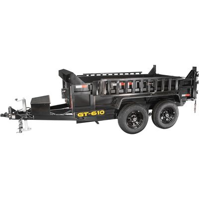 The GT-610 is our affordable 6X10 dump trailer using two 30" hydraulic cylinders to increase the lift ability for the over 7200lb. payload capacity. Options include a battery charger and up to 6 paint color upgrades.