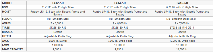 - Brakes: Surge/Hydraulic (NOTE: Surge brakes may be deemed illegal in certain applications), Electric/Hydraulic, Disk Brakes on -5 Model and Above