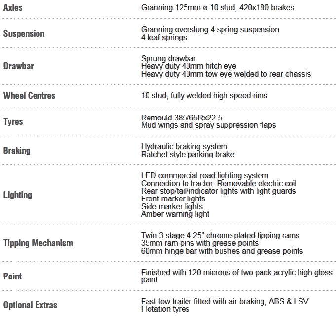Standard features include: Chrome plated tipping rams, sprung drawbar, heavy duty 40mm tow eye, heavy duty tow eyes welded to rear of chassis, inspection ladder, mud wings, spray suppression flaps, ratchet style park brake, rope hooks on every body panel, LED commercial road lighting system with front, side and high level rear marker lights, stop/tail lights and flashing warning light, rear light guards and a hydraulic braking system.