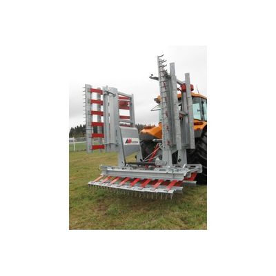 1st Row: scrapers measuring 60 cm with springs to level molehills, etc. 2nd row: independent spreader pallets measuring 30 cm with 1 spring to refine the work. 3rd Row: independent rakes measuring 30 cm with 1 spring for aerating the grass cover. Scarification with original BOTTIN teeth or comb teeth on supports. Steel spring blades. Galvanised frame. Galvanised scrapers and combs. Flexible spring-mounted hitch. Wheels with bearings (equipment standard or optional on certain models). Automatic hitch and bar with centering cones.