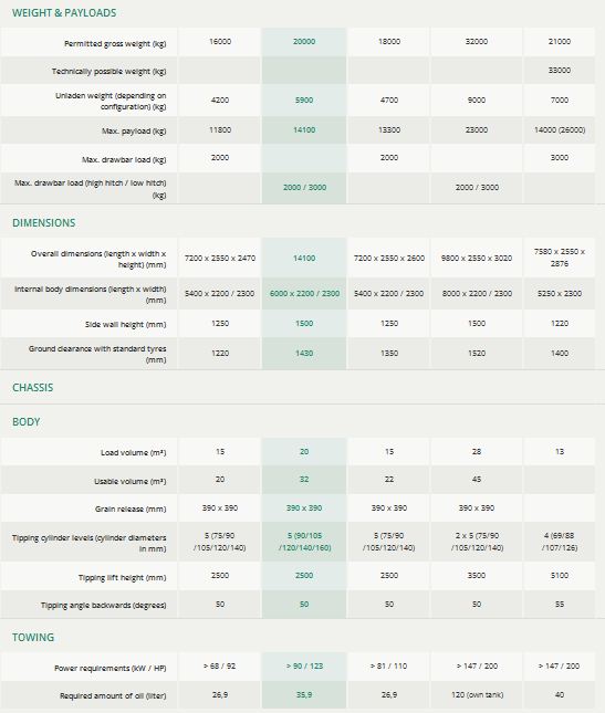 Conical dumper body made of steel plate (5 mm floor and 4 mm walls), no weld seam (foil seam fusion), absolute smooth inner walls, hydraulic tailgate (with double-acting cylinders and hydraulic accumulator), guaranteed grain-tight, grain release with lever, inspection window front, steel mud wings, access ladder according to accident prevention regulation (UVV)Possible tyre dimension