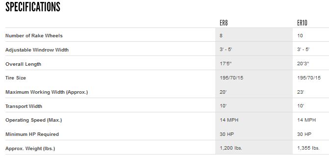 The Rhino V-Type Rake is designed and produced with a farmer’s budget in mind. Simple and efficient describe the ER8 and ER10. The narrow, folded position makes the ER rake convenient to transport from field to field. The ER rake is gentle on your hay, producing a light “fluffy” windrow with reduced “roping” of the crop material. The adjustable windrow width allows you to match the windrow to the pickup of your baler helping to improve efficiency throughout the hay making process. Full size 195/ 70/15 tires are standard equipment increasing unit stability in the field.