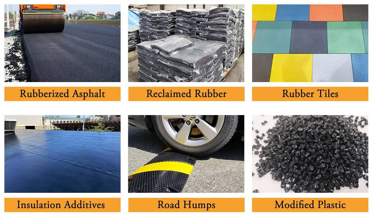 Rubber powder has numerous uses – like rubber powder mixed with asphalt to be modified asphalt widely used in highway application or water-proof industry, or to make reclaiming rubber, or as raw material used as injection molding products, coatings, roofing materials. This micron-size material has the advantage of being incorporated into new or existing formulations for various polymers and finished products.