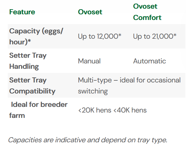 The Ovoset Comfort builds on the Ovoset principles but with greater automation, user-friendly controls, and scalability, making it better suited for growing farms with higher throughput needs.