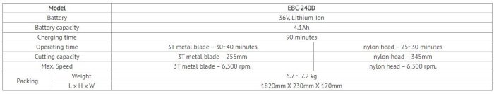 MORI EBC-240D shoulder type brush cutter is using brushed 350W motor, your best choice for your landscaping your garden and regular garden maintenance. This grass cutter can be powered either by 36V 25.2Ah or 36V 6.3Ah DC battery, providing different operation time. LED warning indicator is used to inform users when current or temperature are overload to protect the batteryand the motor. There is also reverse spinning switch for easy removal of grass clipping. 3 minutes time out function is perfect for forgetful users to prevent unnecessary electricity run off. D loop handle is specialized for up-and-down direction shifting, perfect for bumpy landform or tall grass trimming.