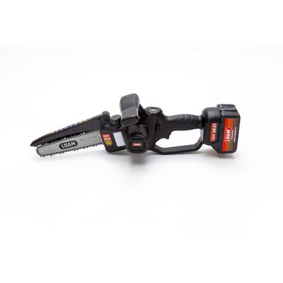 Electric chain saw with plug-in battery. Additional safety handle for working with two hands, double safety switch, integrated oil tank with level visible from the outside, automatic chain lubrication and LED display for battery charge and working range.