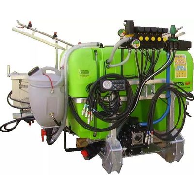 Features: Polyethylene tank with total emptying. Hand-washing cistern. Outer layer. Circuit-washing cistern. Hot-dip galvanized steel heavy profile frame with fork attachments. Low pressure diaphragm pump. 5-section electric proportional control with filter with separate taps for agitator and mixer and electric control box in the cabin. Electric in the cabin. External suction filter with self-filling valve. Inspectable hydraulic agitator. 2-piston hydraulic cross bar with rocker arm with manual mechanical locking. Joint and shock absorber springs. Uniget anti-drip with blue kematal nozzles and drip filters. Hydraulic hoses with quick couplings on the tractor. Without cardan joint.