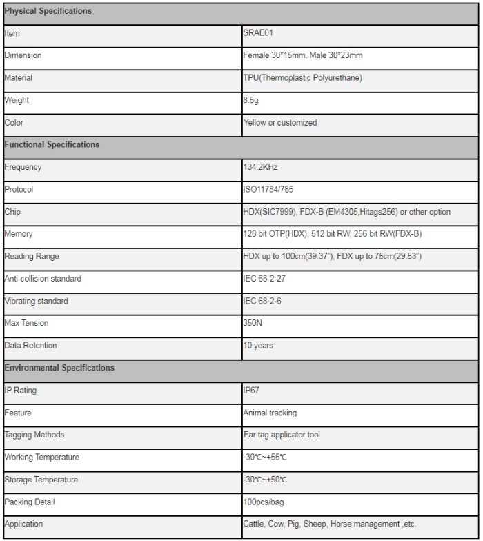 SRAE01 is totally compatible with Allflex electronic ear tag. Animal ear tag is specially designed for animal feeding and slaughtering management. It conforms to the international standard ISO11784 / 11785HDX. It is designed and produced on the imported advanced microchip, with read-write function and unique data security design. In the process of raising and slaughtering livestock and poultry, it can be traced back to the identity of animals by using it with our readers. HDX EID Tags utilize Half Duplex Technology. Each tag is printed with the unique ID number that is stored within the tag`s HDX transponder. HDX EID Tags are made from rigid plastic. Includes Global extended male buttons. Apply with Universal Total Tagger.