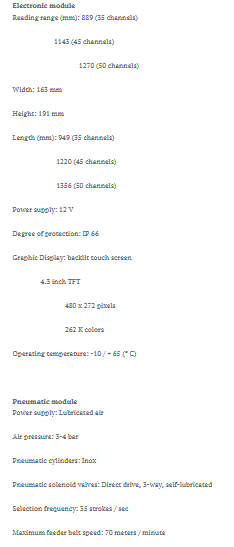 - Complete monitoring of all the functions of the selection, both directly on the electronic module and on the driver`s seat: real-time verification of the selector`s performance and of the work counters during collection (speedometer, hectare counter, malfunction).