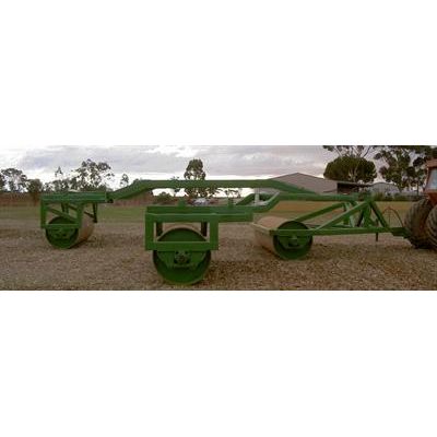 The main feature of this machine is the steering of the wing rollers to track behind (folded) or out (unfolded). The folding is all controlled from the tractor seat. The overhead tow frame is hitched to the lead roller close to the tractor in order to keep the machine length to a minimum when in transport. The height of the frame above the rollers is for clearance on undulating surfaces.
