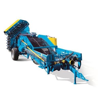 The digging head of the machine is totally independent and free to oscillate for a better adaption to the ground and is composed of two feeler rollers that regulate the digging depth, 2 haulm intake rollers and 2 grass cutting disks. A digging belt 165 cm wide vibrating by means of camshafts, transports the product on a defoliating conveyor of equal width that provides for the cleaning of the leaf part of the plant. Subsequently the product crosses a series of screw rollers (with variable opening) for discharge of small clods or crushed stones. Then the product is placed through another belt on a hydraulically adjustable cleaning hedgehog in inclination and in the speed to carry out a further final cleaning of the product. Finally, a lateral charger belt conveyor with a width of 1 mt conveys the product directly onto the trailer.
