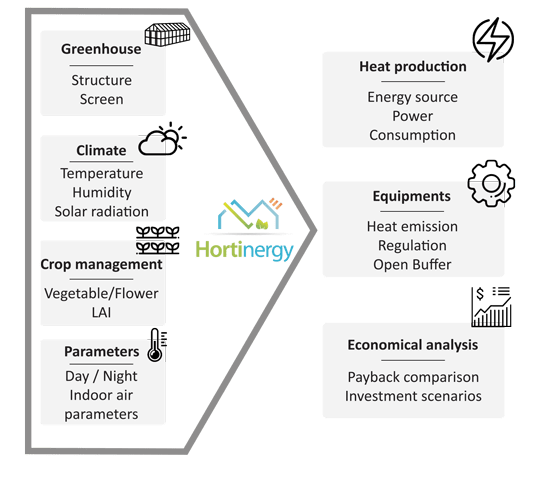 The Hortinergy® energy calculation software is tailored to the specifics of greenhouses and is used to accurately scope your needs. It takes into consideration modern equipment (biomass, open buffer, dehumidifier, etc.) and the impact of vegetation (evapotranspiration) on heating.