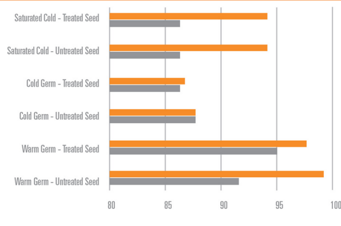 The results from the tests show enhanced germination with the use of ENVIRONOC Seed Treatment (detailed be-low). Tests were performed on both Treated Soybean Seeds (fungicide and inoculant) and Untreated “naked” Soybean Seeds. Not only did seeds treated with ENVIRONOC show strong germination in ideal conditions (Warm Germination Test) but par-ticularly seeds treated with ENVIRONOC Seed Treatment showed significantly better germination in cold/wet conditions (Cold Germination and Saturated Cold Test) with stronger roots.