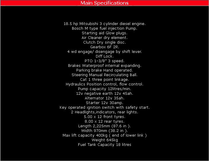 Compact, light weight, Four wheel drive multipurpose tractor..Fully conforms to safety regulations as specified by the EEC..EEC approved foldable roll over protection bar..Overiding PTO Clutch to facilitate use of high inertia implements..Live hydraulic system with adjustable implements position..Lowering speed control..Clear dashboard with all necessary instruments..