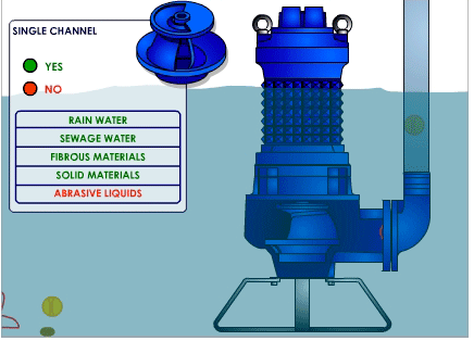 Single channel impeller, for liquids containing fibrous materials and/or suspended solids. Applications: purification plants, tanneries, animal breeding plants.