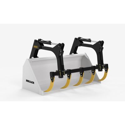 The wide space between the grapple and the bucket allows high-capacity handling of loose material. This combined with the wide opening of the grapple means it is much more effective at handling material than rake or scrap grapples, which tend to squeeze objects rather than pull them into the bucket.