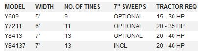 Solid welded frame construction with 2` x 2` x 1/4` wall tubing. Simple one bolt shank spacing adjustment. `S` tines are forged steel and feature reversible points. Optional gauge wheels available.