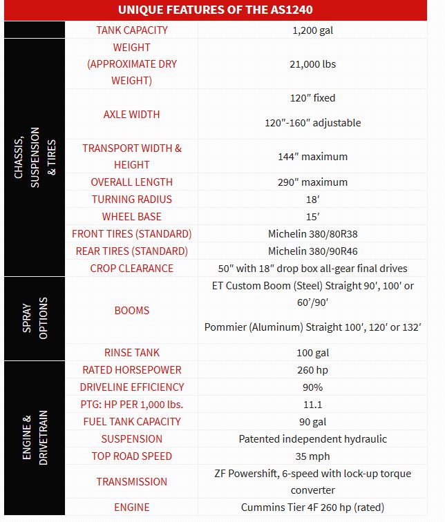 Ideal for the large acreage farmer, the AS1240 boasts a 1200 gallon tank and features a Cummins Tier 4F 260 hp engine. The AS1240 sprayer allows owners to spray more ground faster while keeping higher yields with a large capacity sprayer weighing less than the competition. Apache Sprayer owners enjoy the benefits of less maintenance, less downtime and increased durability for a longer sprayer life, in addition to the lowest cost of ownership and highest resale value in the industry.
