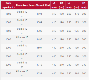 Reinforced and hot dip galvanized frame. The polyethylene tank internally is highly smooth and avoids deposits and encrustations. Hydraulic lines and water hoses are neatly organized and protected by the reinforced plastic cable track. Suction filter with connection for tank loading. Total emptying valve. Safe ladder with handles and pedestal. The boom lifting system is stabilized thanks to a rhomboidal profile guide. Mounts Colibrì (12, 15 and 18 m) and Albatros (15 m) booms.