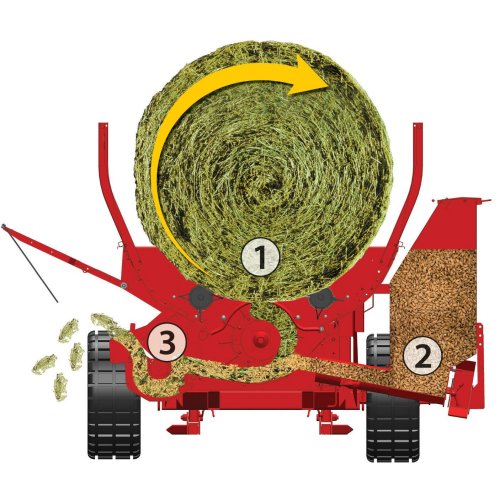 - Cuts all roughages, such as corn stover, canola straw, green feed, alfalfa, to a recommended length — not too fine but an appropriate blend of cut lengths.