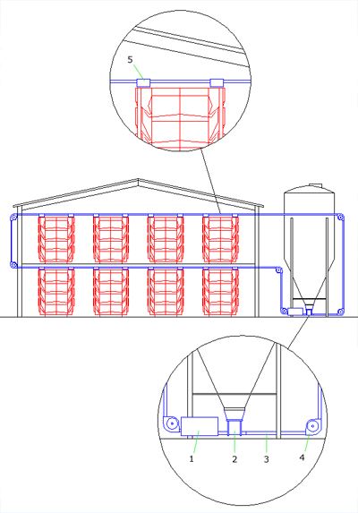 FALCON chain transport systems, thanks to its flexibility, can carry out very tortuous vertical and horizontal circuits, difficult to achieve with traditional screw conveyors. You can get a system with a maximum capacity of 12 tons / hour, with a very low power, ranging from 1.5 to 4 HP per circuit. Con lo stesso trasportatore, si possono collegare uno o più silo di prelievo e distribuire il mangime su uno o due piani. With only one circuit you can connect more than one silo, and distribute the feed in one or two floors.