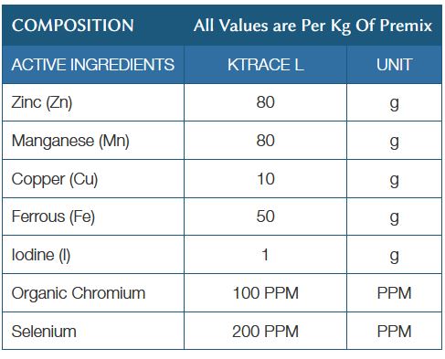 KNC Nutrition with world class technology has developed KTRACE L, an optimum concentration of thoroughly selected trace minerals. KTRACE L premix is highly recommended to meet daily nutritional requirements of the bird. With highest quality of selected trace minerals enhances the health & productivity performance.