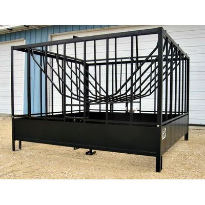 The Common Sense Way to Feed Round Bales. Keeps bale off ground - less spoilage. A wood floor can be installed by owner. Cattle feed at animal height. No feeding over the top. Basket large enough for 6’x6’ bales (Model F 8X8). Easy to move with a loader. Can be hauled on a pickup - 6 sections. 8` long x 8` wide x 70" tall. 28 feed openings. Recommend 1 feeder for approximately 25 dairy or 35 beef cattle. Weight – approximately 700 lbs. Painted black. U.S.A. Patent #5,158,040.