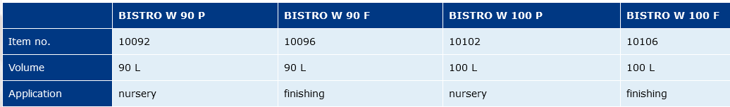 The BISTRO W feeders can be used for piglets (type P) and for finishing pigs (type F). Variable settings allow perfect feed adjustment according to the animals‘ requirements.