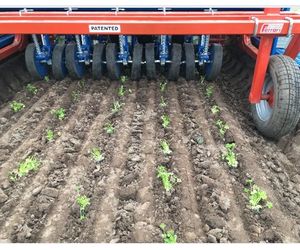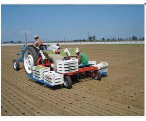 The F Ferrari precision transplanter was designed to transplant lettuce and other vegetables in square blocks from 2.5 to 5 cm. This completely mechanical transplanter is extremely simple and easy to use. FERRARI F is very precise, every single unit is independent from the others and all the plant are left in the ground on a diamond pattern to guarantee a proper growing area to every single plant. F transplanter is equipped with a very narrow ploughshare and can work properly even on very difficult ground conditions. The transplanting machine output is up to 2,500 plants per hour per row. The machine can work either on flat ground or raised beds.