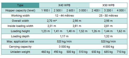 - The rate shutter has been redesigned and now enables stepless rate adjustment from 3 kg to 1200 kg depending on the speed and spreadwidth. With a flow rate possible of 520 kg/min, the X40 and X50 is able to obtain impressive work rates !