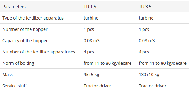 The fertilizer-bringing outfits are designed to bring solid granulated and powdered mineral fertilizers in the soil at cultivation the rows of vineyards, perennial plants and other frutescent planted in rows with distance between them from 1,6 to 2,2 meters (for TU-1,5) and from 2,5 to 3,5 meters (for TU-35). The outfit TU-1,5 is supplied on the frame of Universal suspended vineyard machine – 2,0 and TU-3,5 on the frame of Universal suspended vineyard machine – 3,5 produced in “KAMT” joint-stock company – Karnobat.