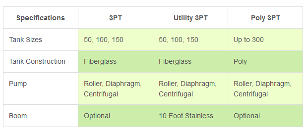 SDI has designed several models of tractor mounted 3 point sprayers, the Utility 3PT, the Ag Master 3PT and the Poly 3PT. These units have multiple tank capacities. Two models feature a commercial grade fiberglass tank, external sight gauge, welded steel epoxy coated frame and non-corrosive plumbing components. The Poly 3PT features an economical polyethylene spray tank. The Utility 3PT sprayer is economically priced, featuring a PTO driven roller pump, 10 foot stainless steel wet boom, weed wand with 15′ of 3/8 spray hose, jet agitation and manual spray controls. Just hook this unit to your 3 point hitch, add chemical and start spraying.