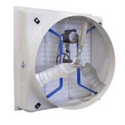 The 54" X-Brace model fan is a through-wall mount design with a gel coated white fiberglass housing, optional poly discharge cone* and an improved plastic vane shutter. (*Poly discharge cone sold separately, item # AS-54206)