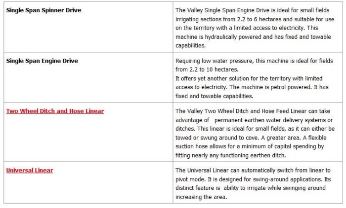 Valley systems provide coverage for both large and small fields of 20 hectares or less. For this reason the company offers numerous products made of rugged components similar to their larger counterparts.