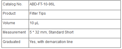 Filter Tips 10ul, Standard Short. Product Item : ABD-FT-10-96L. Volume: 10 ul. Size: 5*32 mm. Brand: ABD. Manufacturer: Haimen Aibende Experimental Equipment Co., Ltd..
