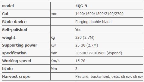 4QG-9 reciprocating lawn mower with eccentric shaft single knife drive, no wood link, the end of failure, flexible and efficient. The forward speed is 15km / h - 20km / h. Blade with thick 3 mm 65mn material, blade with a new forging double blade, strong and sharp, durable. The 4QG-9 mower is an ideal tool for harvesting natural pastures, growing forage, buckwheat, oats, straw and straw.