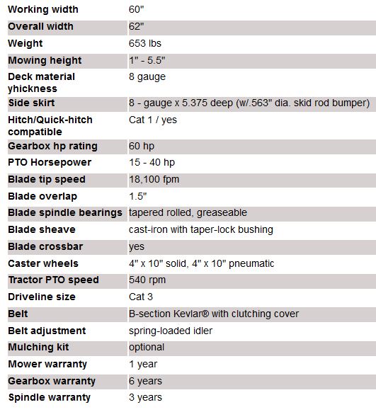 60-inch cutting width, Rear Discharge.Three-point hitch: Cat 1.Tractor HP range: 15-40 hp.Ideal for mowing large lawns, sports fields, and parks.Strong, eight-gauge steel deck.Floating lower hitch points to manage uneven terrain.Powerful 60 hp gearbox.Kevlar® belt with clutching cover protects parts and increases lifespan.Anti-shimmy caster wheel springs reduce shock loads.Tubular caster wheel arms for added strength.ASABE quick-hitch compatibility ensures faster, easier and safer hook-ups.Six-year gearbox limited warranty.Three-year spindle limited warranty.One-year mower warranty