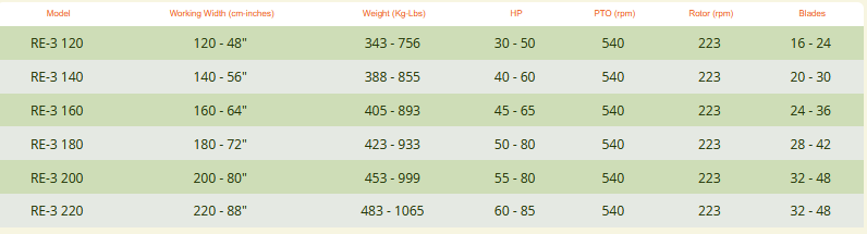 The RE-3 is ideal for tractors from 30 up to 85 horsepower. Usually found on heavy-duty and more expensive tillers, the durable slip-clutch driveline and 6 blades (or 4) per flange, with a forward-rotation rotor that provides maximum mulching. Single speed gearbox (RE-3) or four speed gearbox (REC-3) are both available.