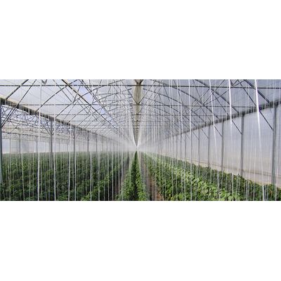 This model offers a solution to ventilation and humidity problems and is resistant for both cold and hot climates. The V9.6 is designed to provide maximum growth area and superb natural light distribution together with fixed openings, located in the center of the arches, allowing better ventilation and removal of condensation. The roof ventilation provides 12% of the total ventilation of the covered area. The roof vent can be naturally ventilated and closed by insect net or ventilated by roll-up curtain. V9.6 greenhouses are suitable for all types of vegetables and flowers, including varieties that require the hanging trellis technique.