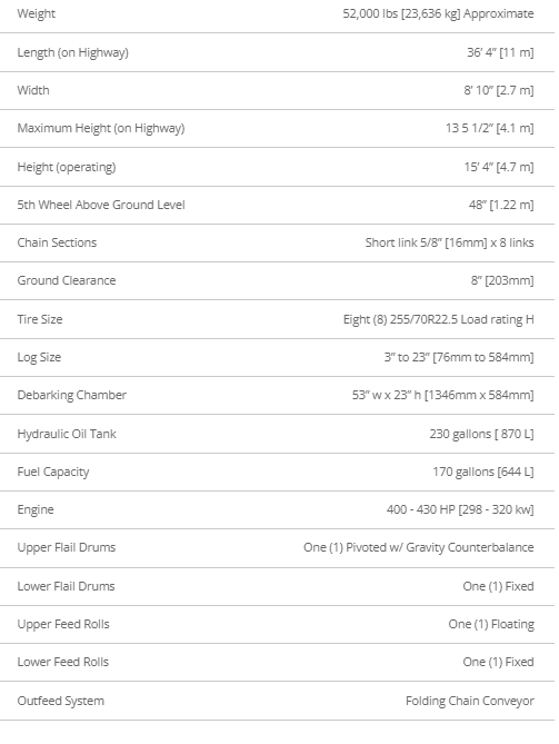 Both models include state of the art hydraulics that allow all the infeed rolls, flail drums and outfeed rolls to be infinitely variable. Bark and limbs are removed in the enclosed housing, protecting the system from damage. The FD-2300, 2 Flail discharges the bark and waste with a 22’-6’ [6.86m] chain conveyor while the 2600-4 flail model removes the waste by an oversized hydraulic pusher, keeping the debarker chamber clean.