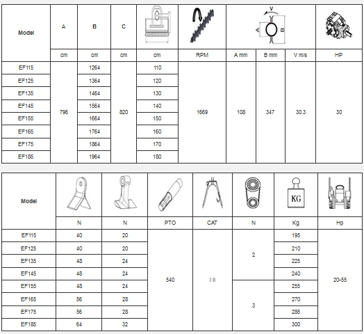 For 20-55 HP tractors. Cast-iron gearbox with free wheel. Adjustable rear roller with mud scraper. Protective front fender. Adjustable tensioner. Side skids. Cat. I or II three-point hitch. Cardan shaft support. 30HP gearbox. Forged hammers or Y knives . aCE safety guards.