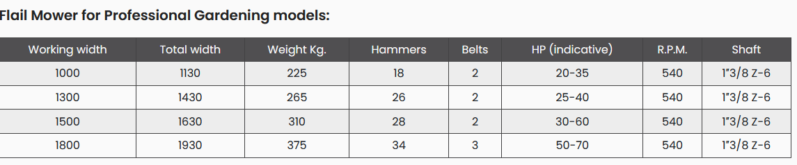 The Flail Mower for Professional Gardening is specially designed for shredding grass, whether on golf courses, urban green spaces, parks and gardens, and for branches of up to 2cm in diameter, and is for both private and professional use. This mower is suited to the smallest tractors, from 20 to 70 HP. Low power absorption. Roller for height adjustment. Very solid and sturdily built. Uniform shredding.