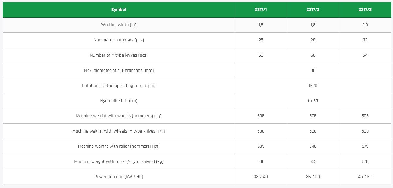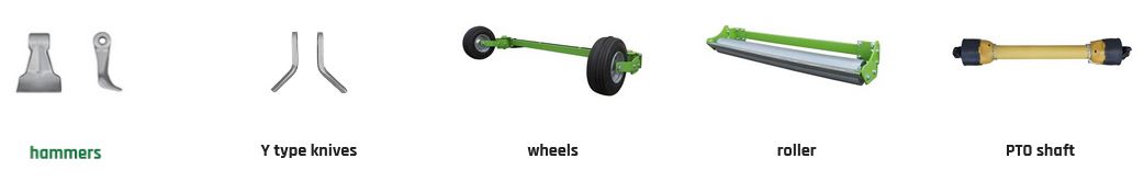 The machine can be equipped with Y type knives or hammers. The Y knives are designed for mowing the grass, while the flail hammers are used for shredding small branches and shrubs.