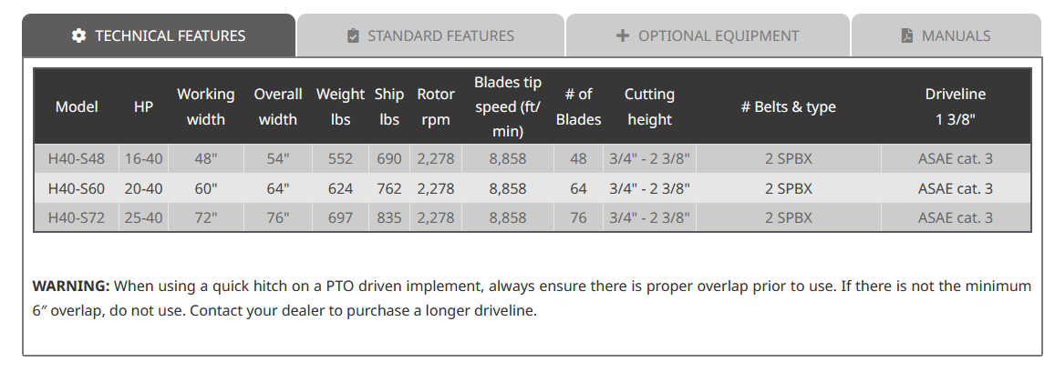 The H40-S flail mowers are expertly designed for category 1 compact tractors with horsepower ranging from 16 to 40 HP, making them an ideal choice for homeowners, landscapers, school complexes, and orchards. These versatile mowers come in three mowing widths 48″, 60″, and 72″ to accommodate various landscaping needs.