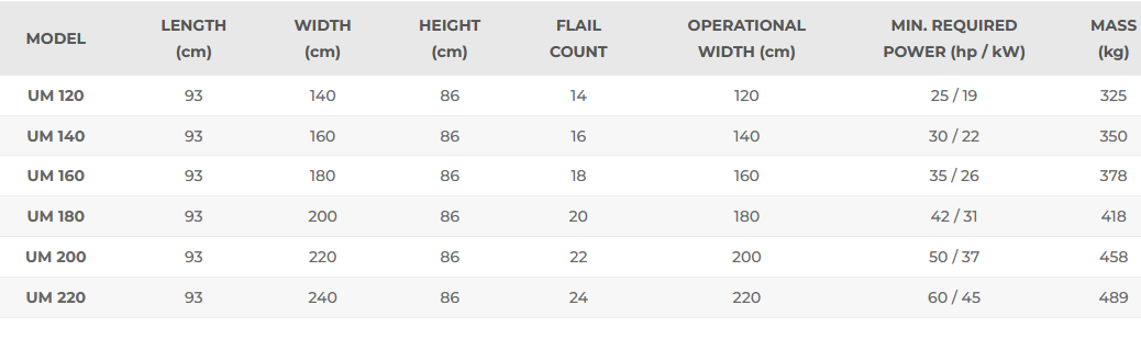 Flail topper series UM is intended for usage on all agricultural areas, maintenance of green spaces and neglected fields. Mulches harvest residue and branches up to 5 cm in thickness. Quality and robust construction enables intensive use. Tractor drive is transmitted through the drive shaft to the auxiliary shaft of the gearbox and then through the belts to the main shaft.