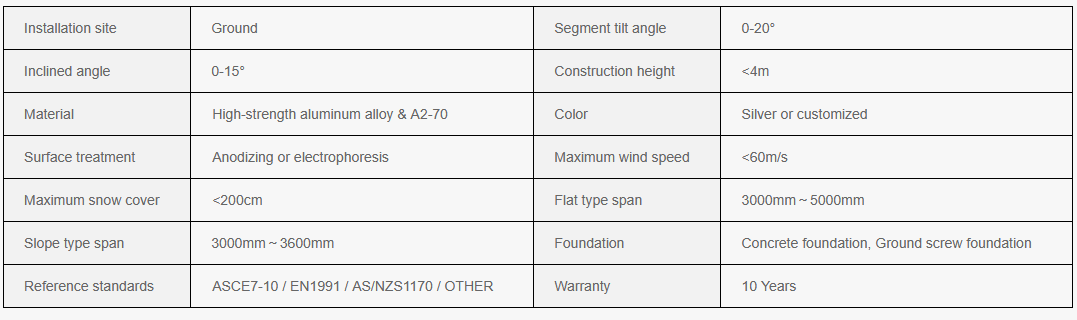 In addition to the foundation, the Grace Solar flat type farm mounting system adopts an all-aluminum alloy structure, which can flexibly respond to the needs of light transmission. Also it has a large span, and it`s easy to install. The span, ground clearance and shading rate can be customized according to customer needs.